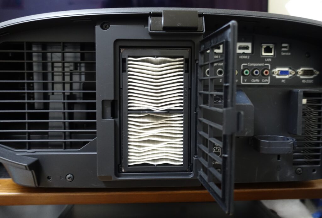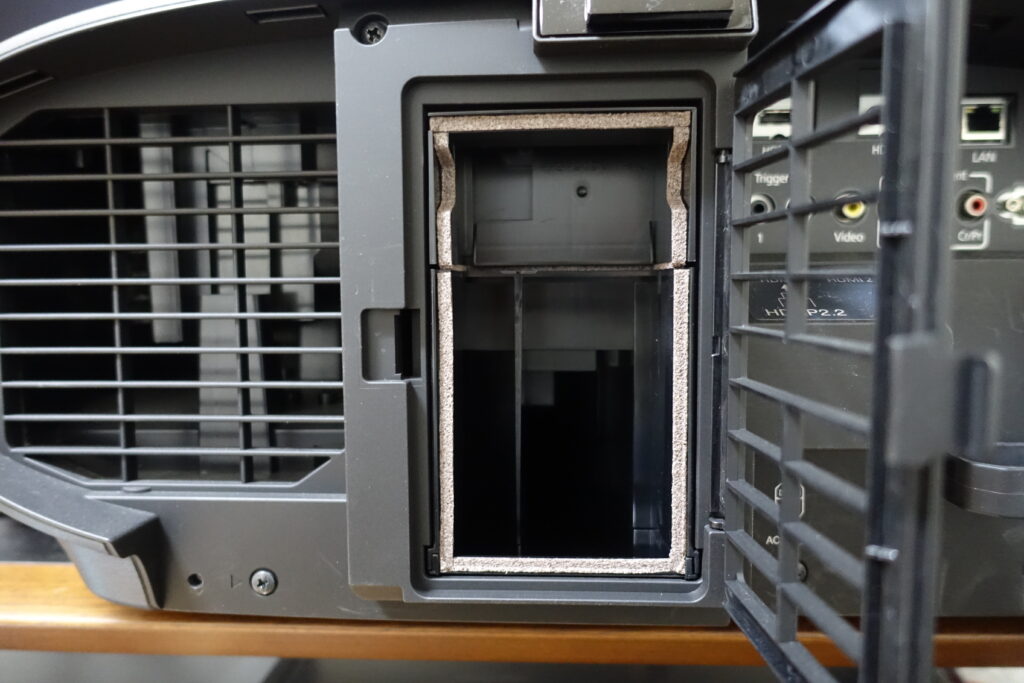 埃カバーはドアの扉のように開いて開けられます。これが非常に開けやすくて取り出しが便利です。こんなプロジェクターみたことがないです。お客さんに寄り添った技術力のあるエプソンです。